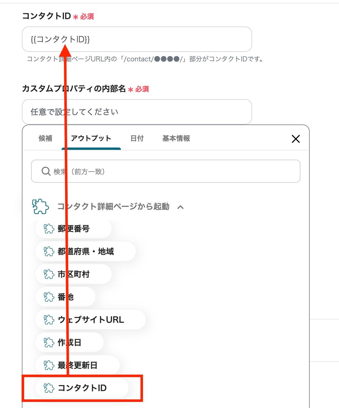 下記のように「コンタクトID」と「カスタムプロパティ」は取得した値から設定して、「テスト」をクリックして下さい。