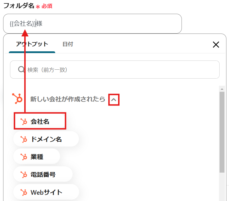 HubSpotのアウトプットを使用して、フォルダ名を設定しておけば、自動的にフォルダ名を作成できます。