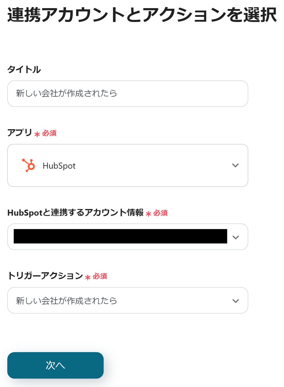 まず、HubSpotの設定から行うため、「新しい会社が作成されたら」をクリックしてください。