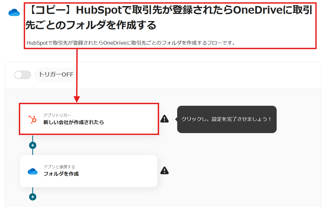 今回は「HubSpotで取引先が登録されたらOneDriveに取引先ごとのフォルダを作成する」という以下のテンプレートの設定方法をご紹介します。