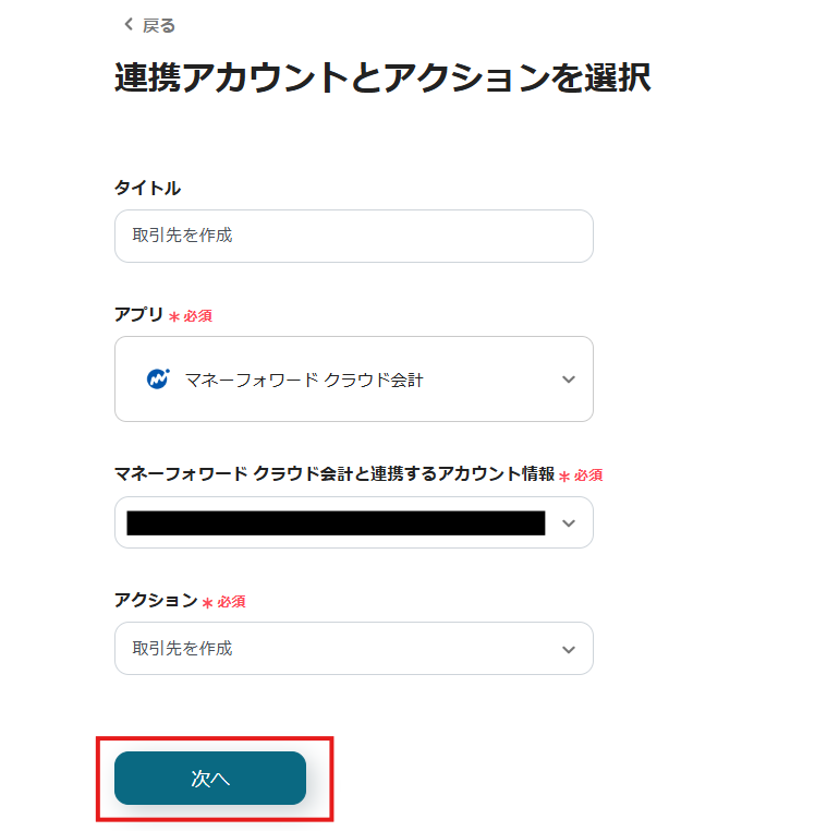 表示された画面で必須項目を入力し、「次へ」をクリックします。