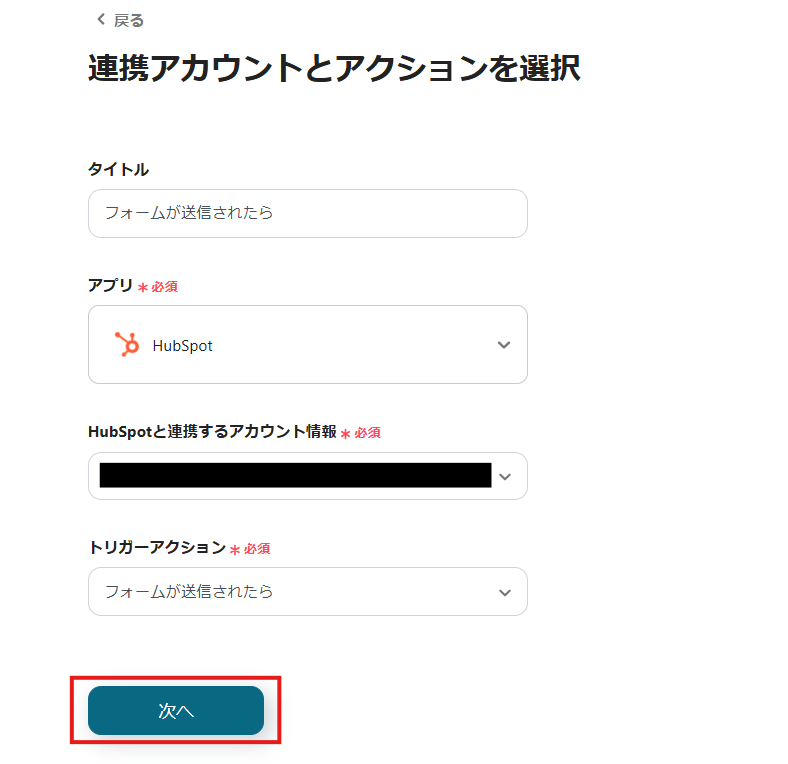HubSpotのトリガーで「新規コンタクトが登録されたら」を選択し、連携アカウントを設定してください。