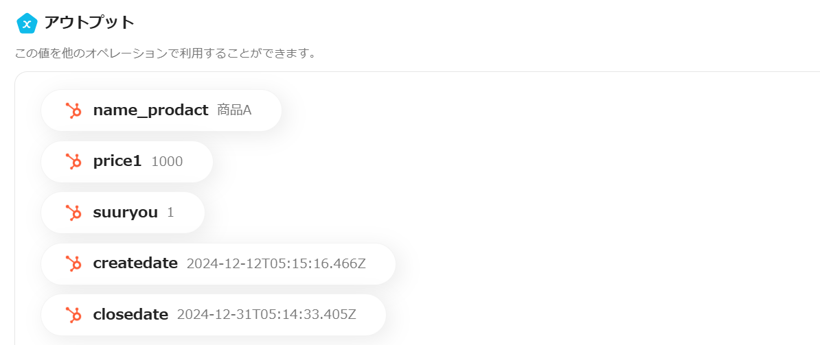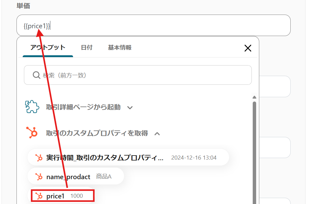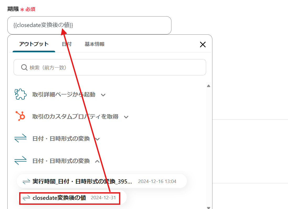 {{○○○○}}となっているその他の項目は、以下のようにアウトプットから選択します。