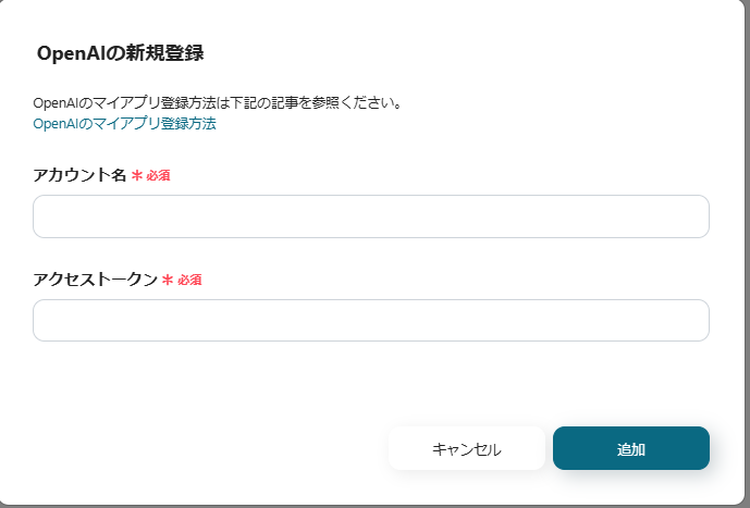 OpenAIの新規登録画面に、アカウント名とアクセストークンを入力し「追加」をクリックしてください。