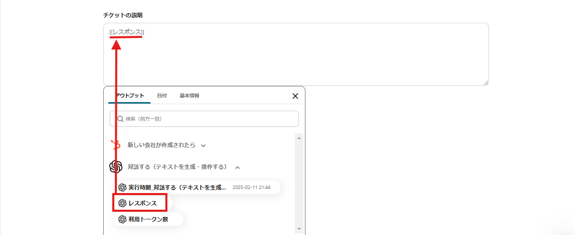 この設定をすると、「OpenAIの返答内容」をチケットの説明に引用できます。