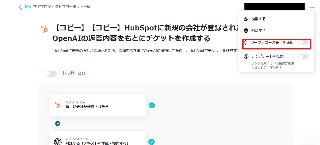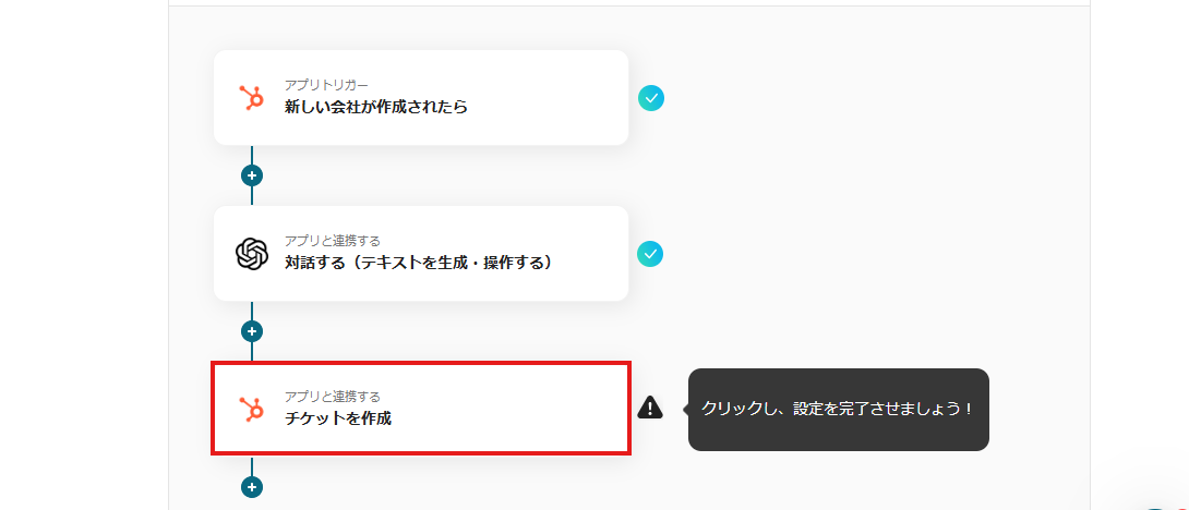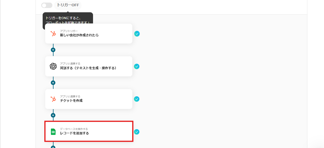 これで「HubSpotに新規の会社が登録されたら、連携したOpenAIの返答内容をもとにチケットを作成する」フローの完成です!