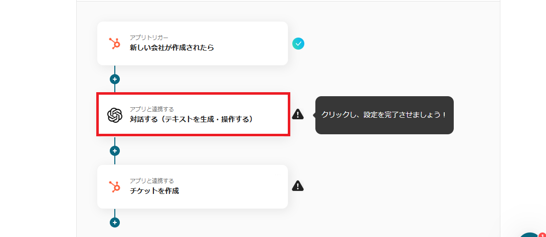 HubSpotとOpenAIを連携すると、HubSpotに新規の会社が登録されたら、OpenAIでテキストを自動で生成しチケットを作成できます。