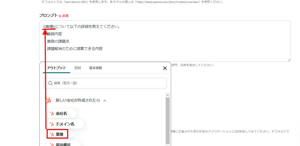 このように設定すると、HubSpotに登録された会社情報から「業種」を自動で取得しプロンプトに引用することができます。