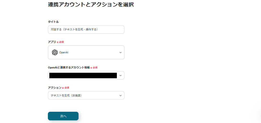 アクションは「テキストを生成」を選択して、「次へ」をクリックしてください。