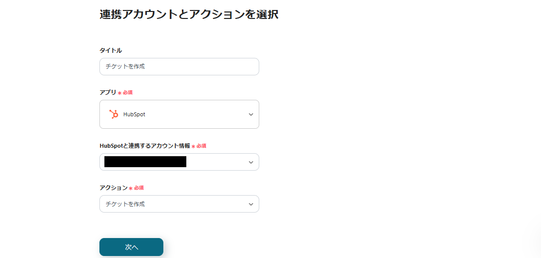 アクションは「チケットを作成」を選択して、「次へ」をクリックしてください。