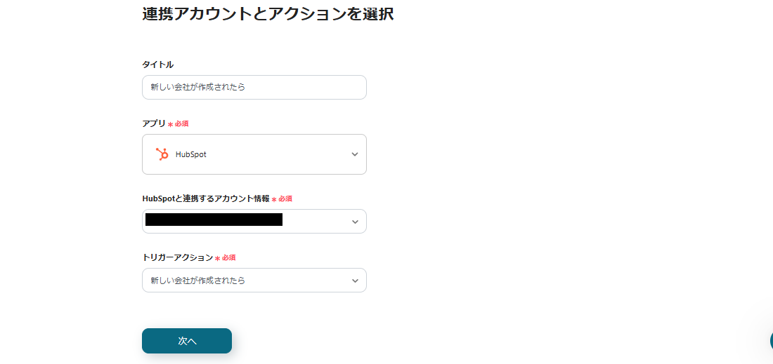 トリガーアクションは「新しい会社が作成されたら」を選択して、「次へ」をクリックしてください。