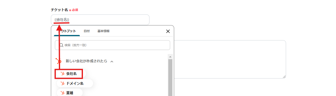 このように設定すると、チケット名をHubSpotに登録された「会社名」で自動登録できます。