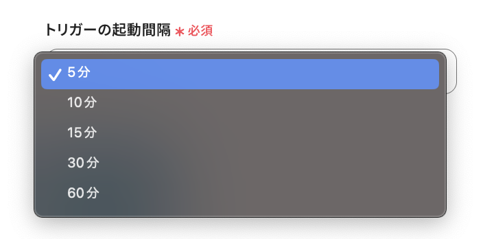 ・トリガーは5分、10分、15分、30分、60分の間隔で起動間隔を選択できます。