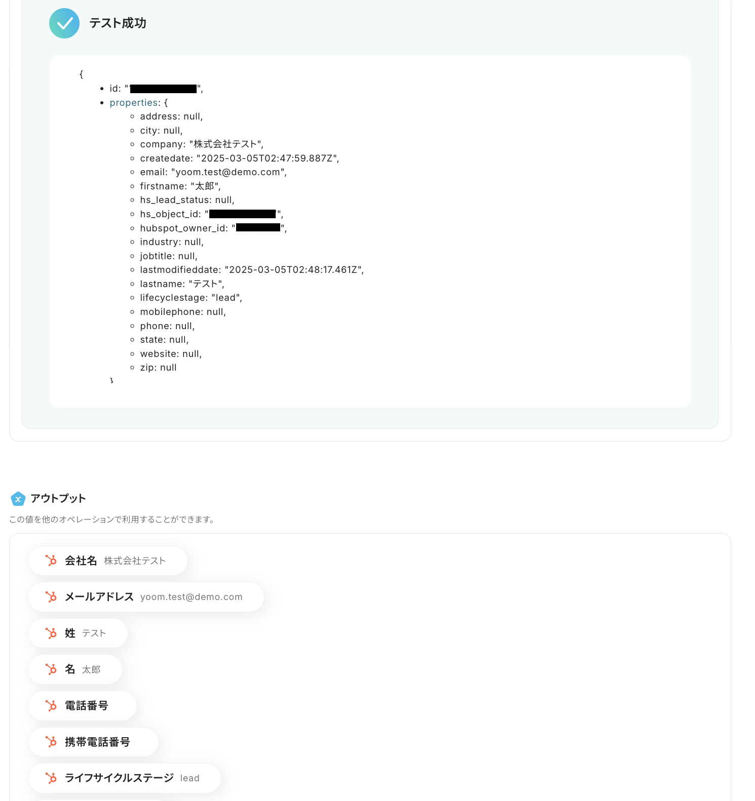 作成後、Yoomの設定画面に戻り「テスト」を実行し、取得されるアウトプットを確認してください。