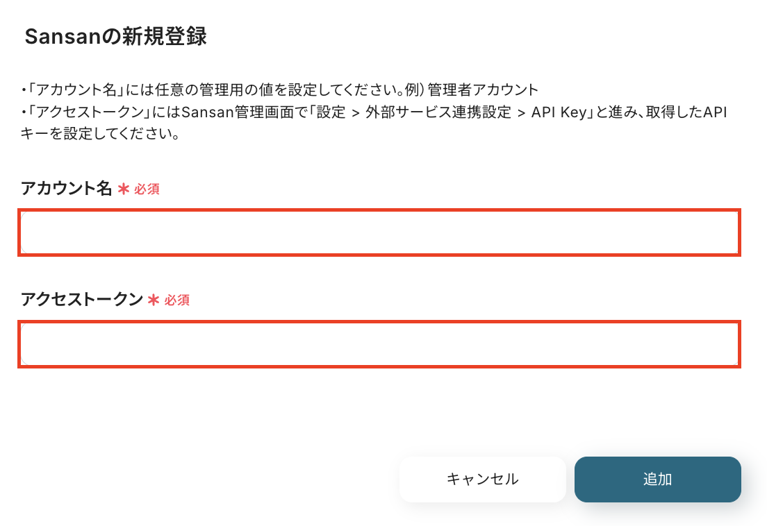 Sansan管理画面で「設定 > 外部サービス連携設定 > API Key」と進み、取得したAPIキーを入力してください。