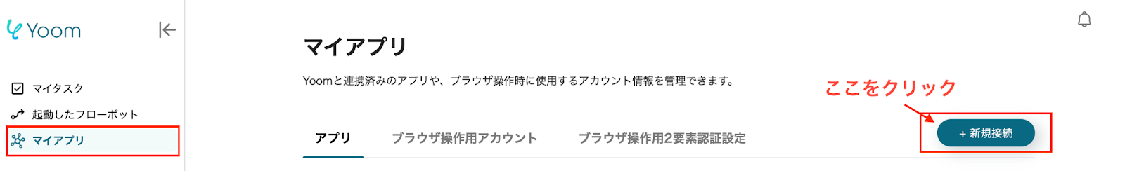 マイアプリ登録は、Yoomの画面左側にある「マイアプリ」をクリックし、右側に表示される「+新規接続」をクリックします。