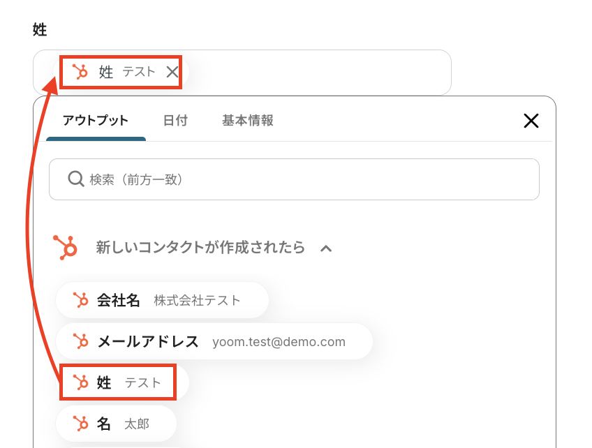 自動で登録したい項目を、トリガー設定で取得したアウトプットを引用して設定することで、コンタクトごとの内容に合わせて登録できます。