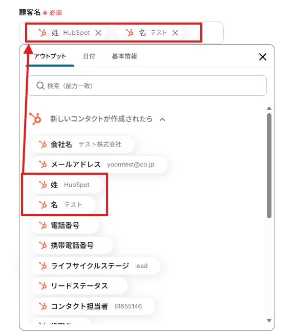 「顧客名」「メールアドレス」「電話番号」は、入力欄をクリックして表示されるアウトプットから選択してください。
