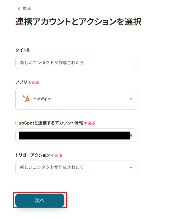 2.表示された画面で必須項目を入力します。トリガーアクションはそのままにして、「次へ」をクリックしましょう。
