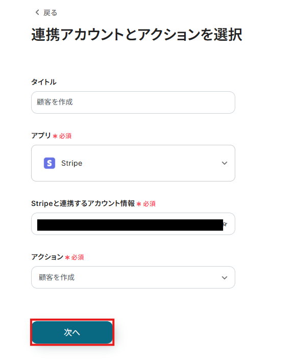 表示された画面で必須項目を入力し、「次へ」をクリックします。
