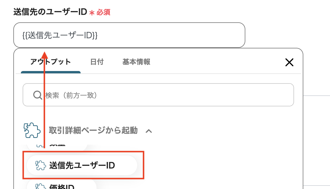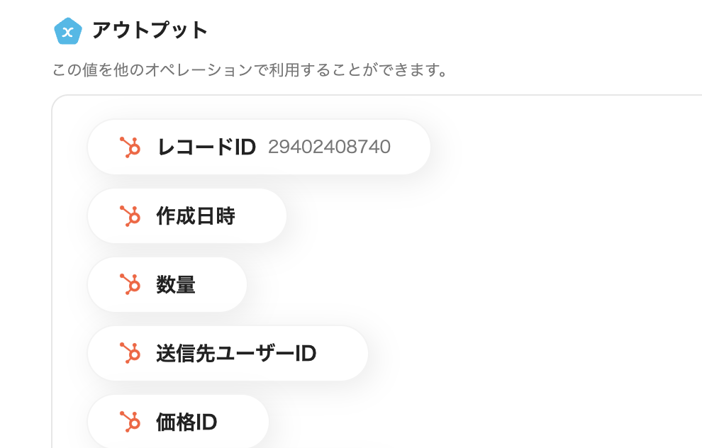 (以下の画像は、例として「送信先ユーザーID」「数量」「価格ID」などの情報をHubSpotに事前に格納し、アウトプットとして取得したものです。)