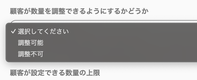 (4)「顧客が数量を調整できるようにするかどうか」の項目は、プルダウンから任意のものを選択することができます。