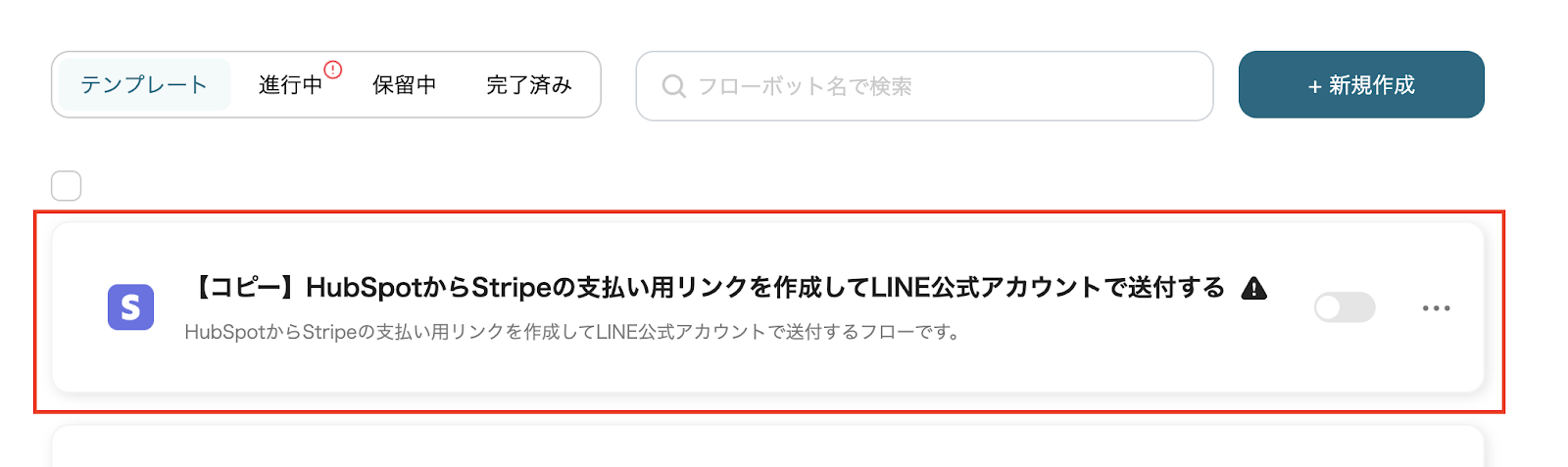 では、「HubSpotからStripeの支払い用リンクを作成してLINE公式アカウントで送付する」のテンプレートを使ったフローボットを作成していきましょう。