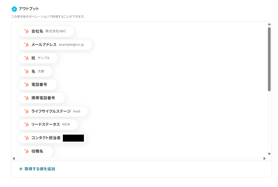※表示されているアウトプットは「この値を他のオペレーションで利用することができます。」と表記があるように、次の設定でも活用できます。