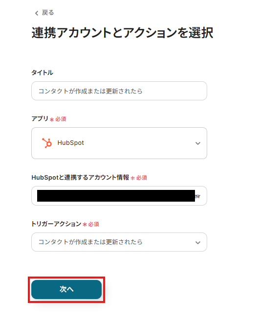 2.表示された画面で必須項目を入力します。トリガーアクションはそのままにして、「次へ」をクリックしましょう。