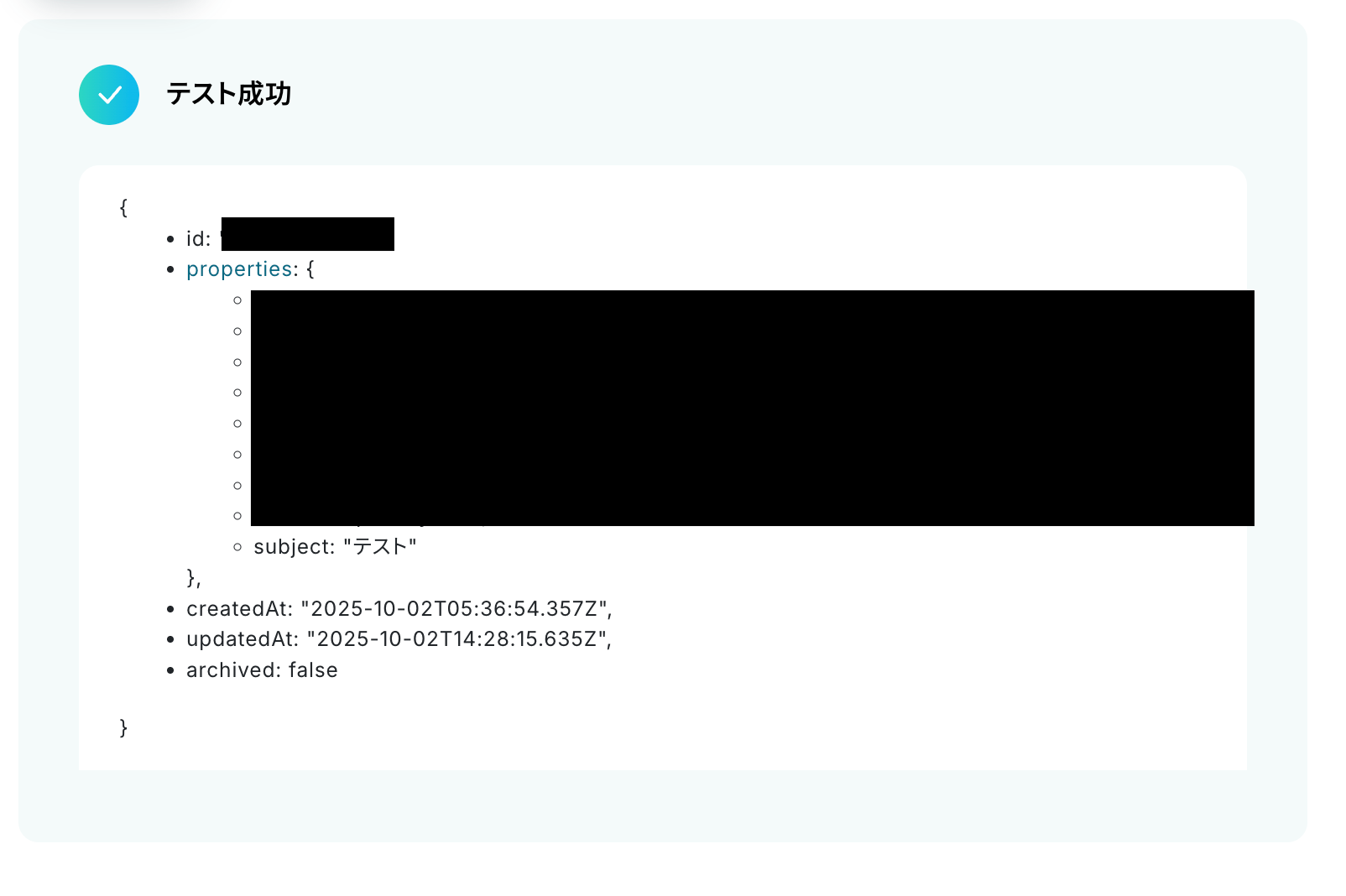 テストが成功するとテスト成功画面と取得した値が表示され、HubSpotのデータが確認できます。「保存する」をクリックして完了です!