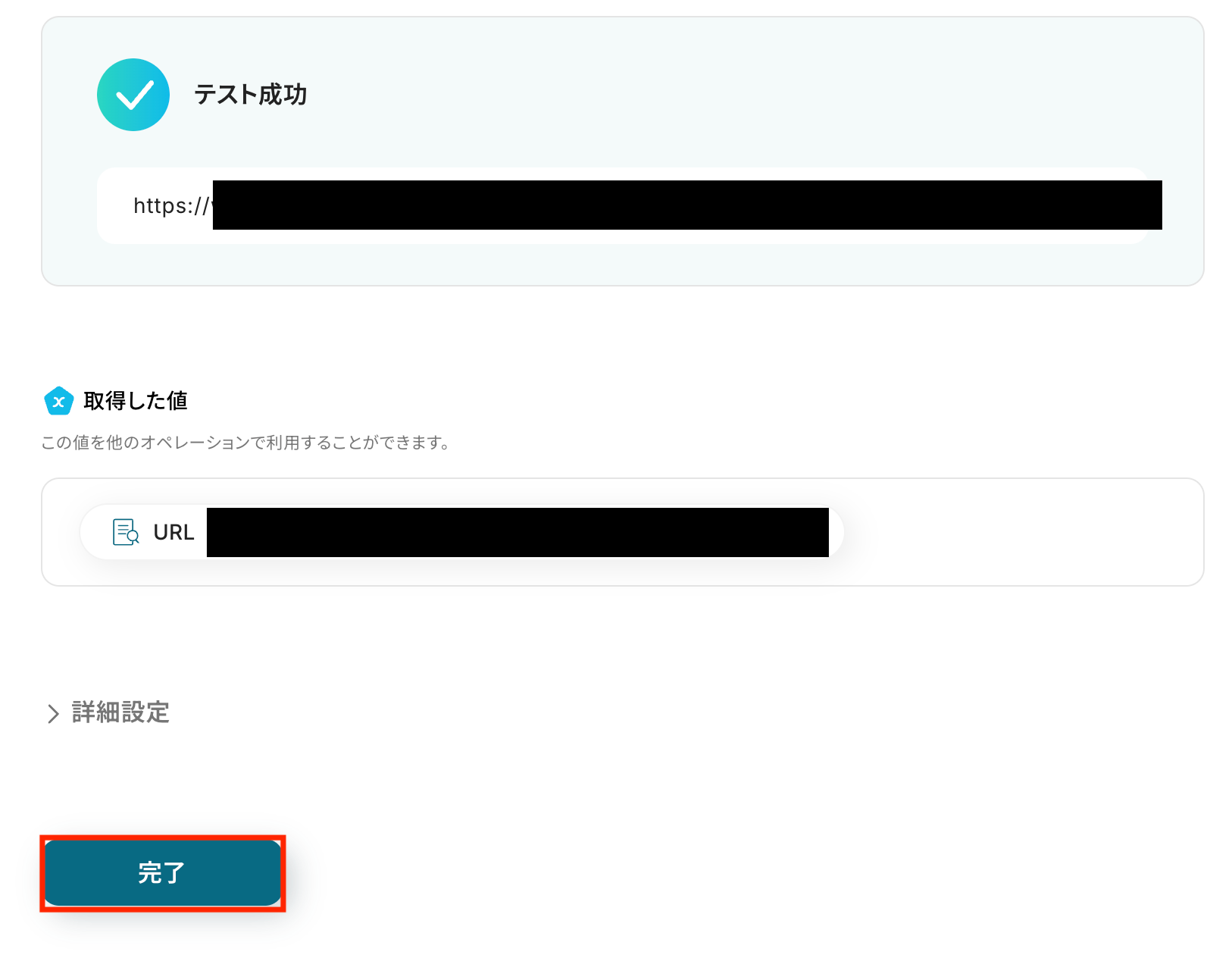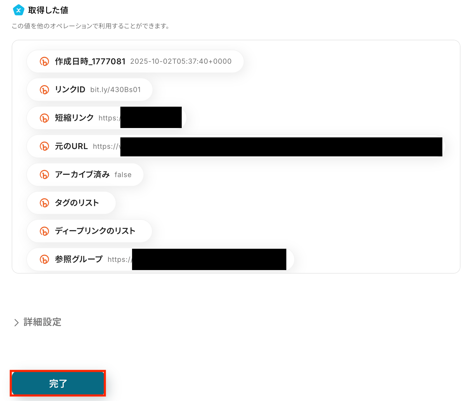 取得した値の一覧に短縮リンクが表示されます。問題なければ「完了」をクリックします。
