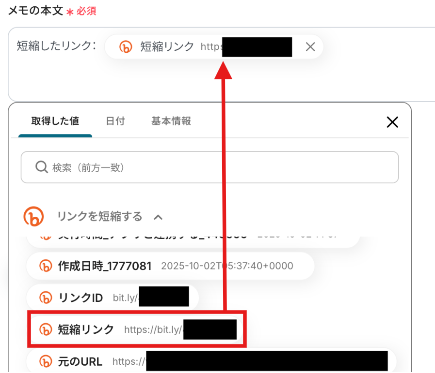 取得した値から「短縮リンク」を選択しましょう。また、必要に応じてテキストの直接入力も可能です。なお、取得した値を活用せずテキストを直接入力した箇所は固定値のため定型文となります。