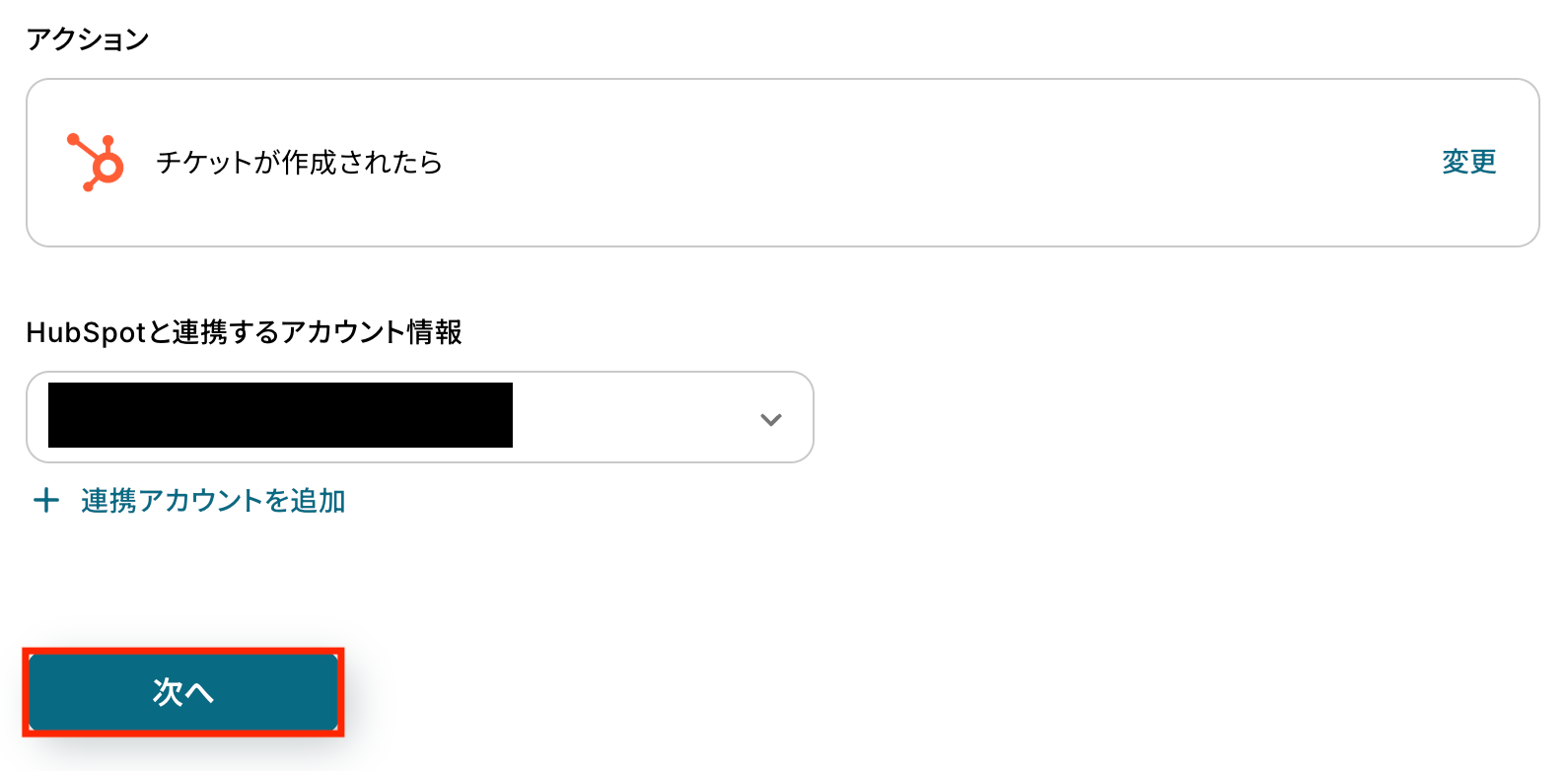 HubSpotと連携するアカウントを選択します。準備ができたら「次へ」をクリックします。