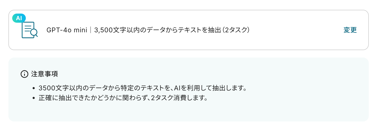 今回デフォルトで設定されているAIモデル(GPT-4o mini)は、3500文字以内のデータから抽出可能です。こちらは任意で変更が可能です。
