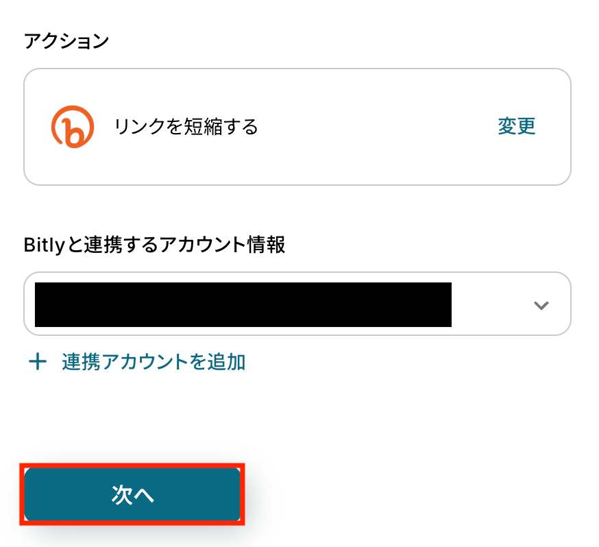 Bitlyと連携するアカウントを選択します。接続が完了したら「次へ」をクリックします。