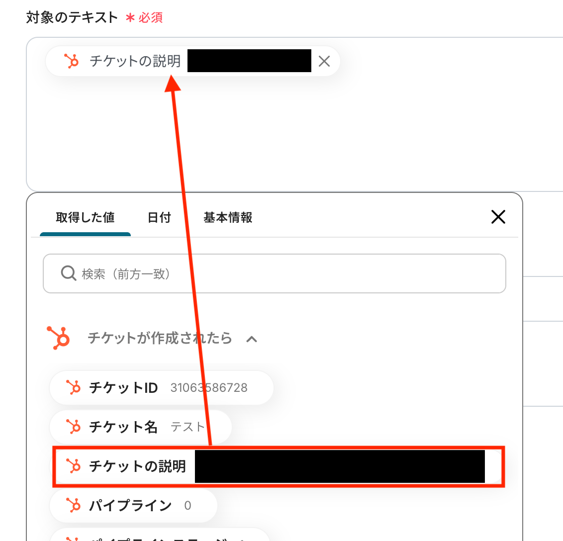 画像のように抽出対象のテキストとして「チケットの説明」を、取得した値から指定します。