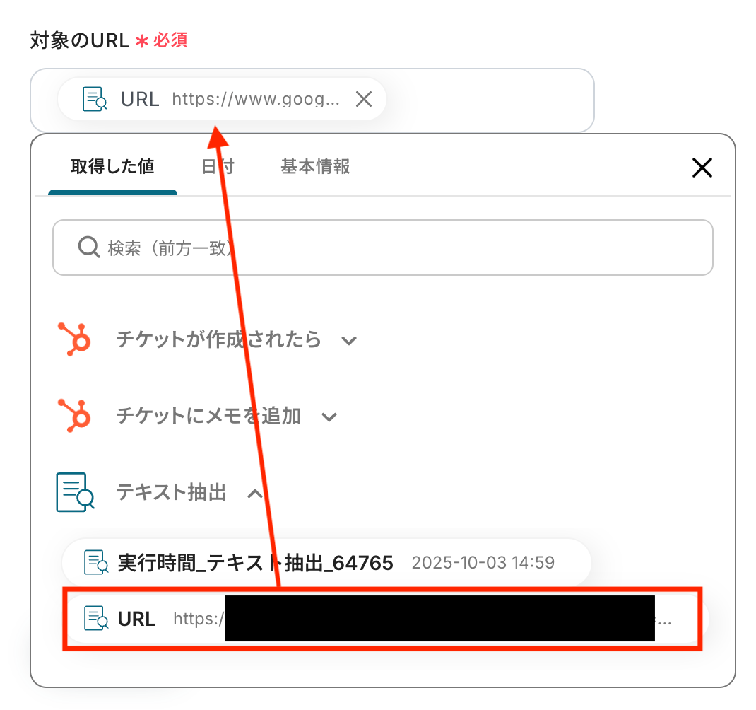 対象のURLとして先ほど抽出した「URL」を指定します。