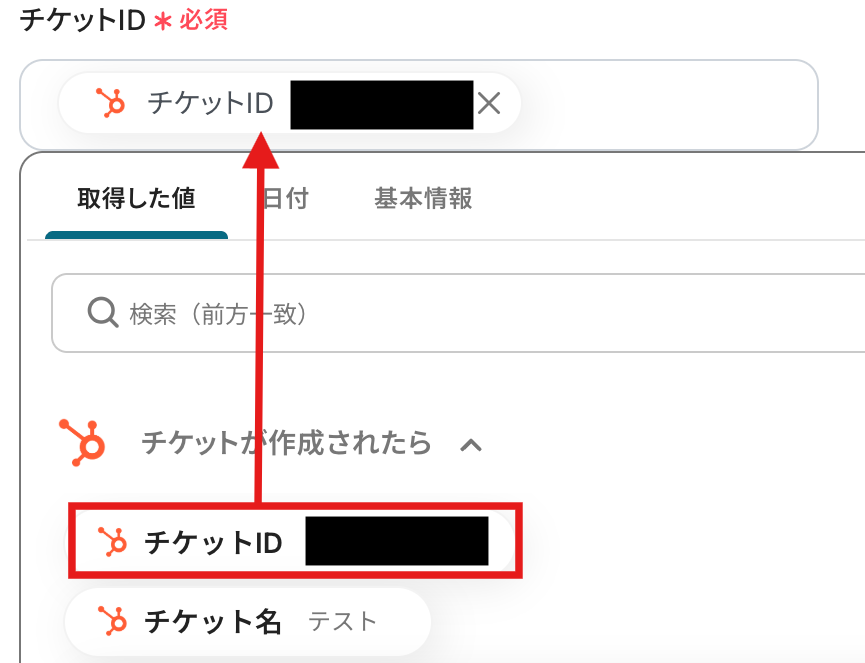 対象のチケットIDを指定します。チケット作成時に取得したIDを取得した値から選択してください。