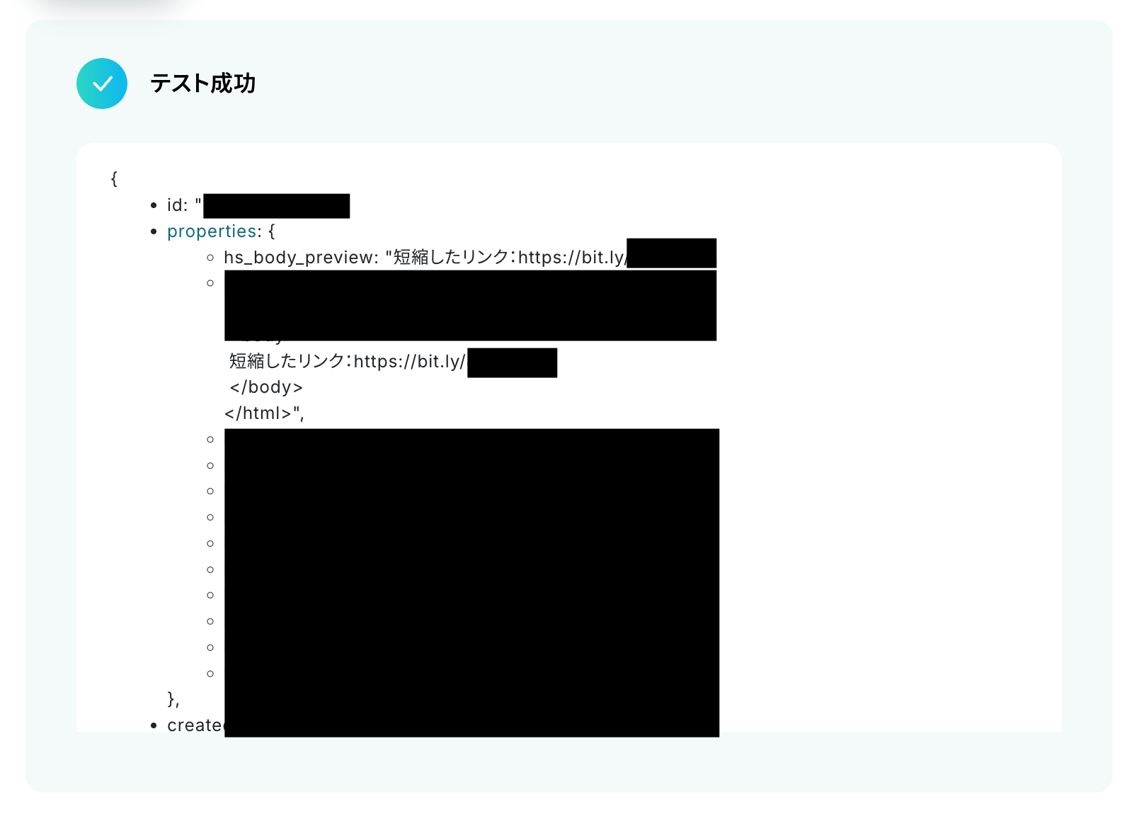 テスト成功時には対象のURLが抽出されます。この値を次のBitlyのアクションで活用し、URLを短縮します。