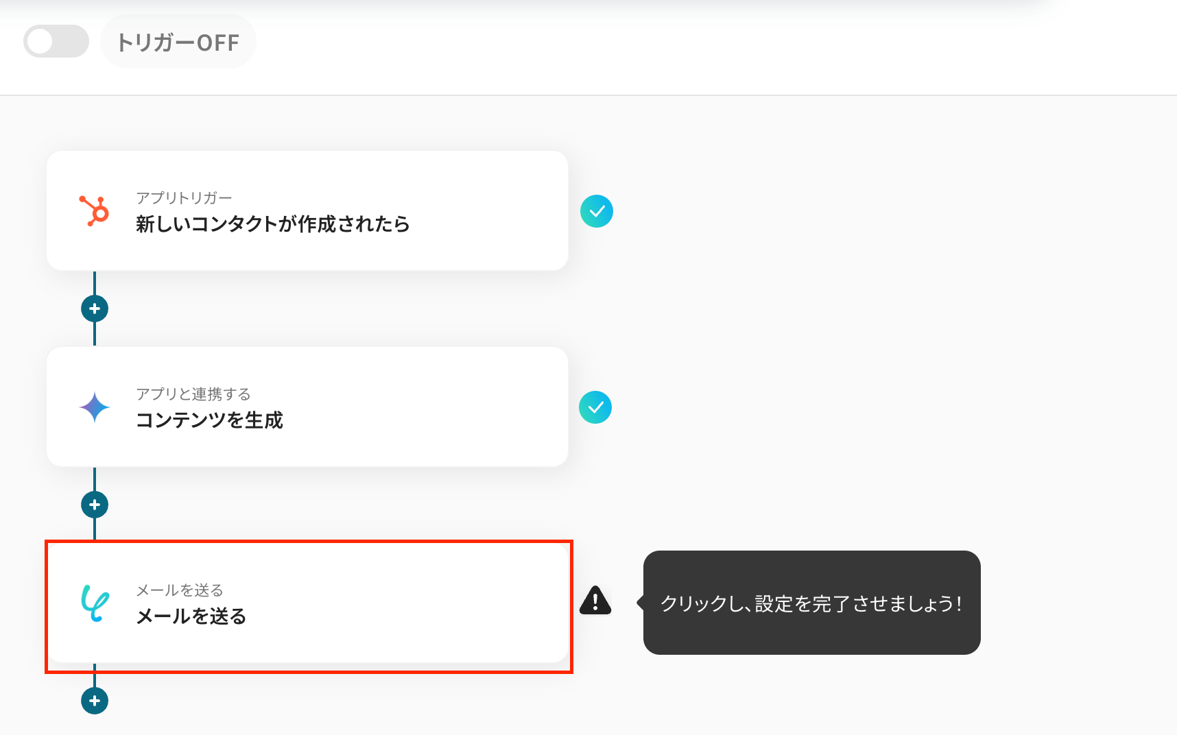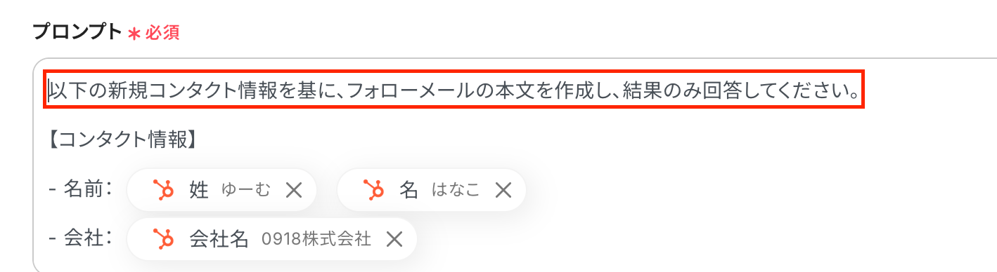 コンタクト情報としてHubSpotの取得した値から必要な項目を選択します。 このように、直接テキストを入力した箇所は固定値=定型文になり、取得した値を活用した箇所はフローが起動する度に変動する値となります。