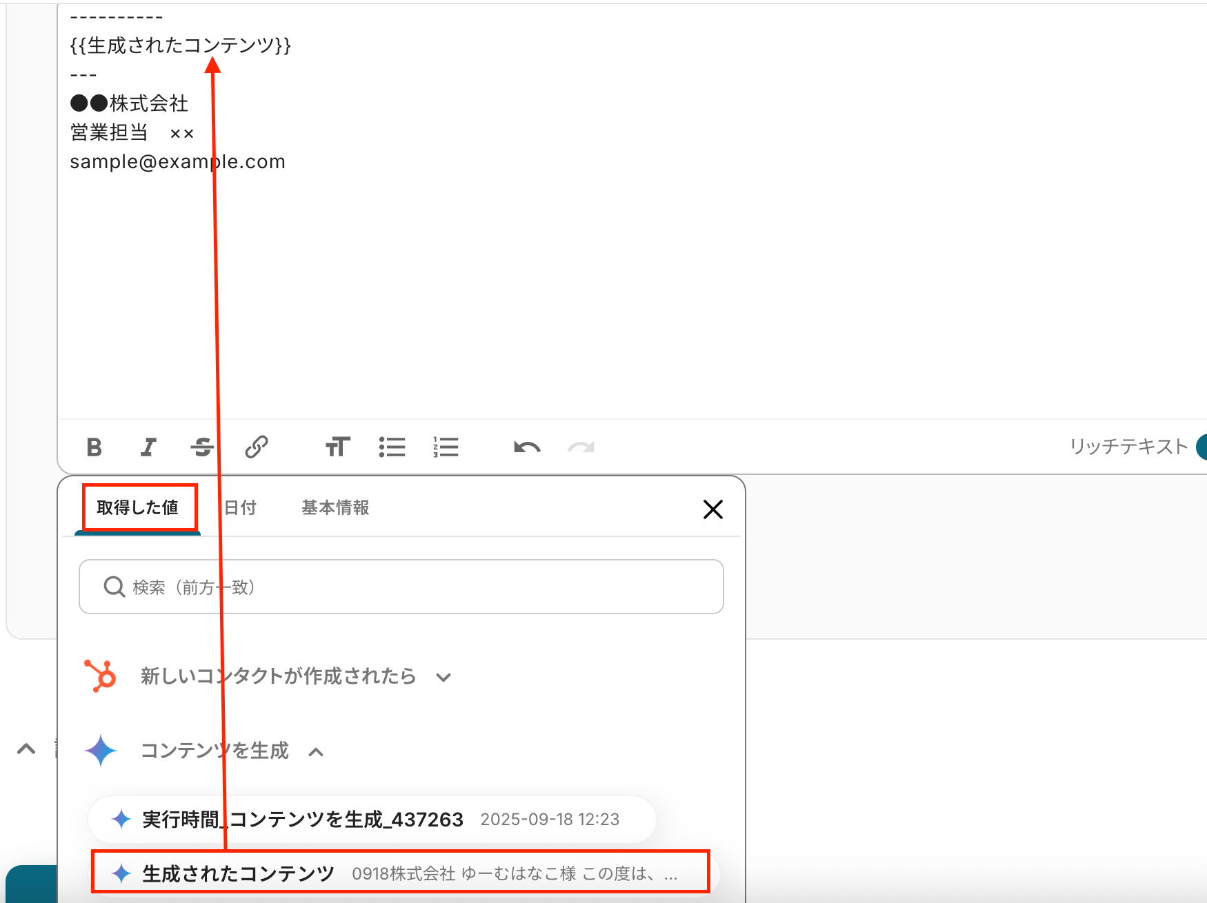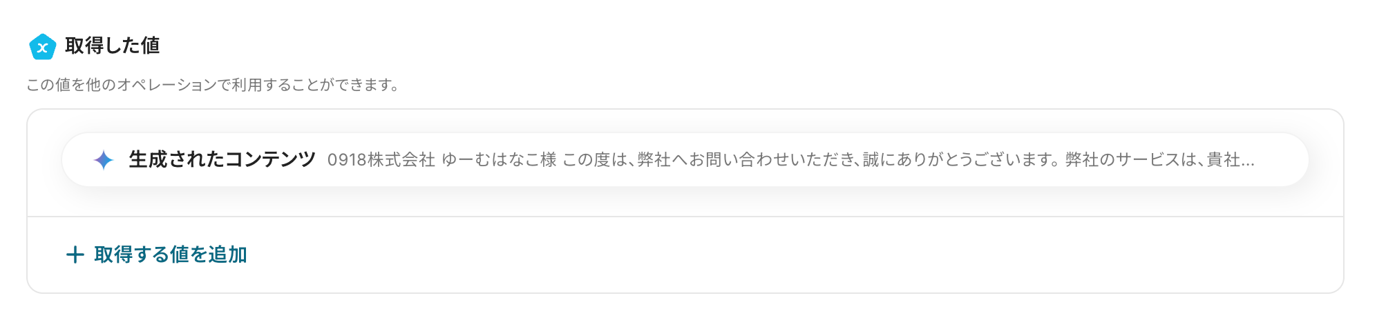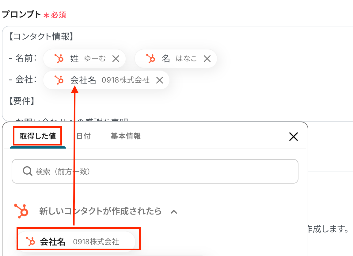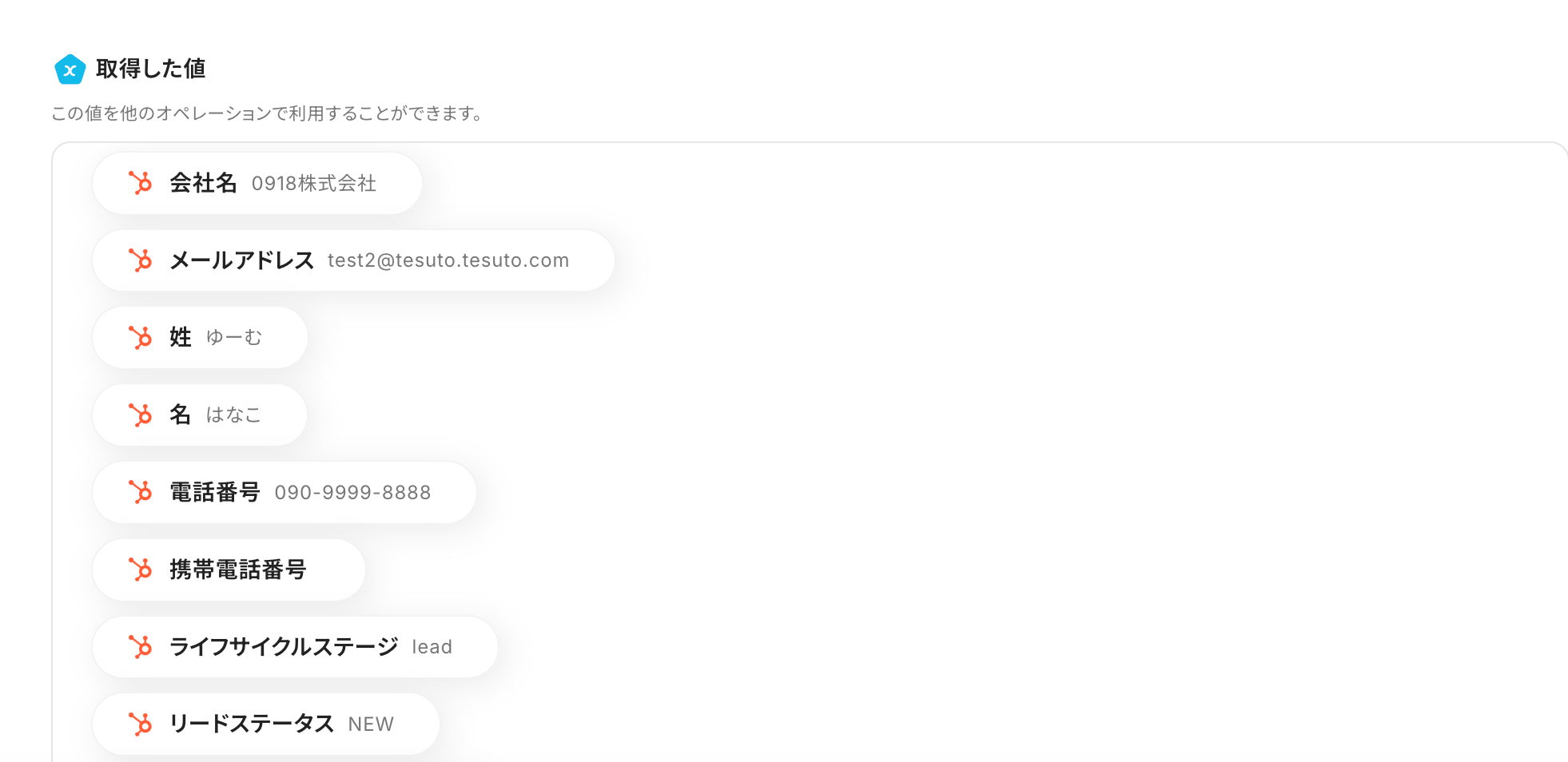 テストが成功すると取得した値にHubSpotの情報が追加されます。 この取得した値は後続のオペレーションで活用することでGeminiのプロンプトに取り入れることが可能です。 詳しくは以下を確認してください。