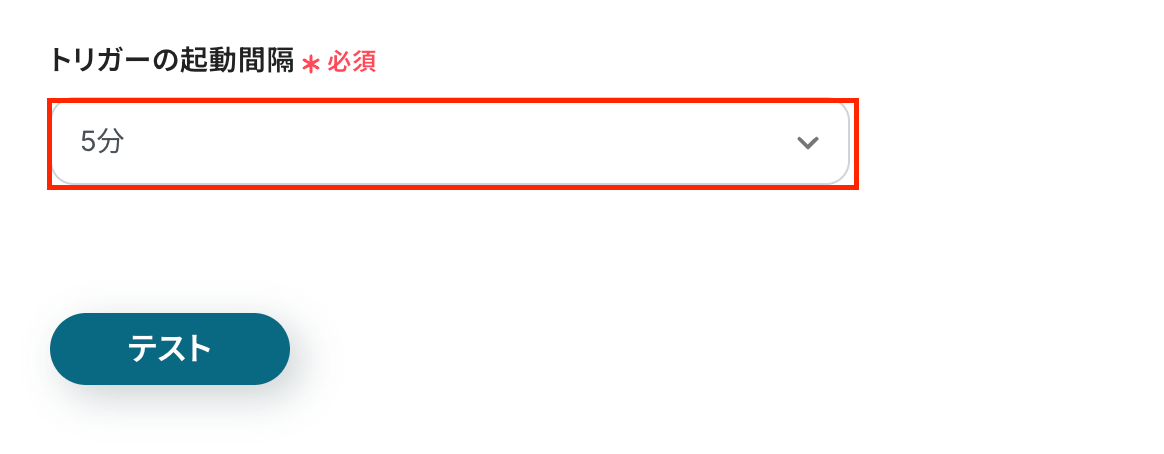 アプリトリガーのAPI接続設定に進みましょう。 トリガーの起動タイミングは、5分、10分、15分、30分、60分のいずれかで設定できます。 ご利用プラン によって、設定できるトリガーの最短間隔が違いますが、基本的にはそのプランの最短の起動間隔にしてください。