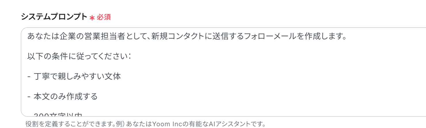 システムプロンプトには、文字数などの指示文章を作成してください。 設定後、テストをクリックします。