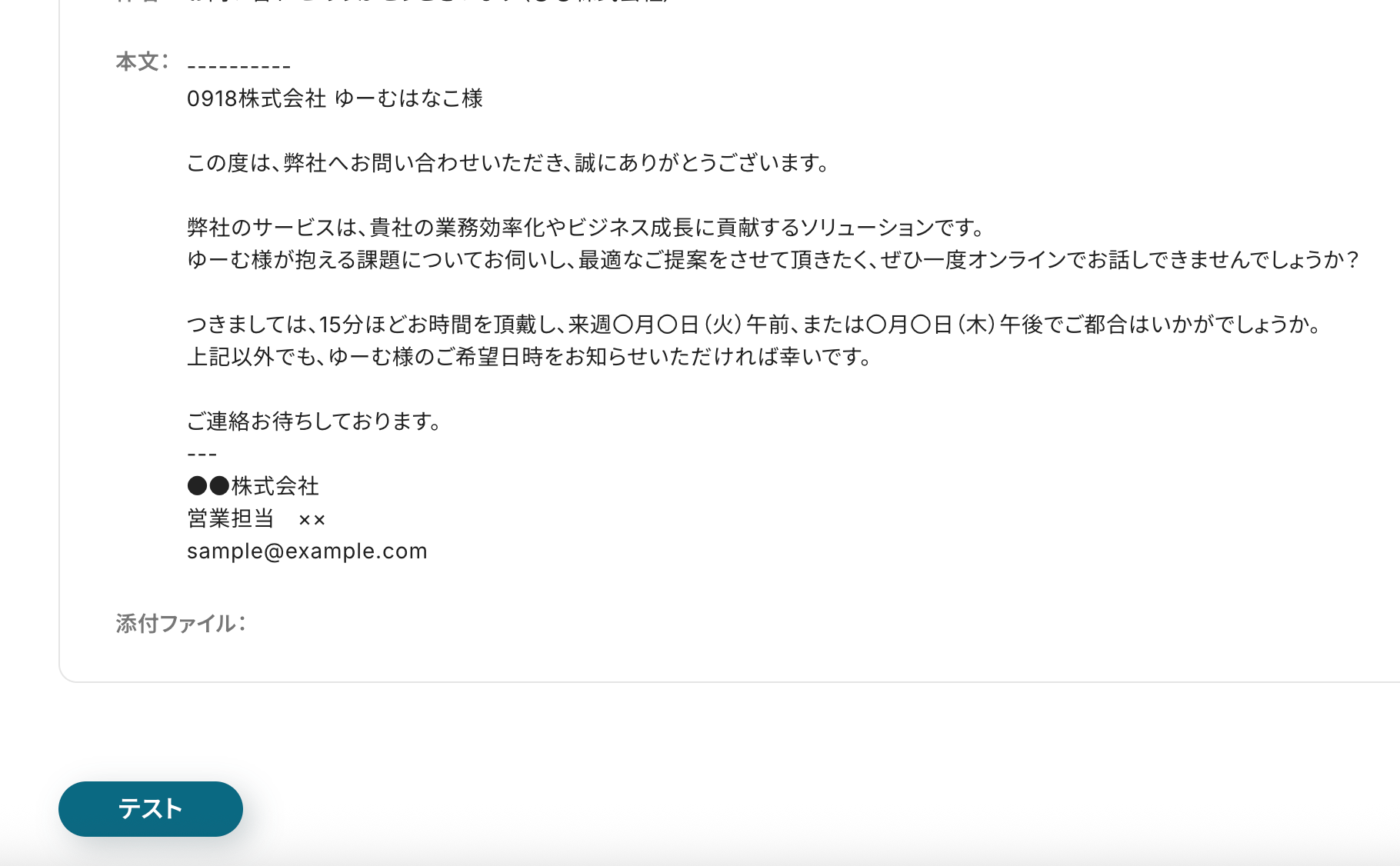 メール送信のテストの画面で、メール内容に間違いがないか確認しましょう。 問題なければテストをクリックしてください。