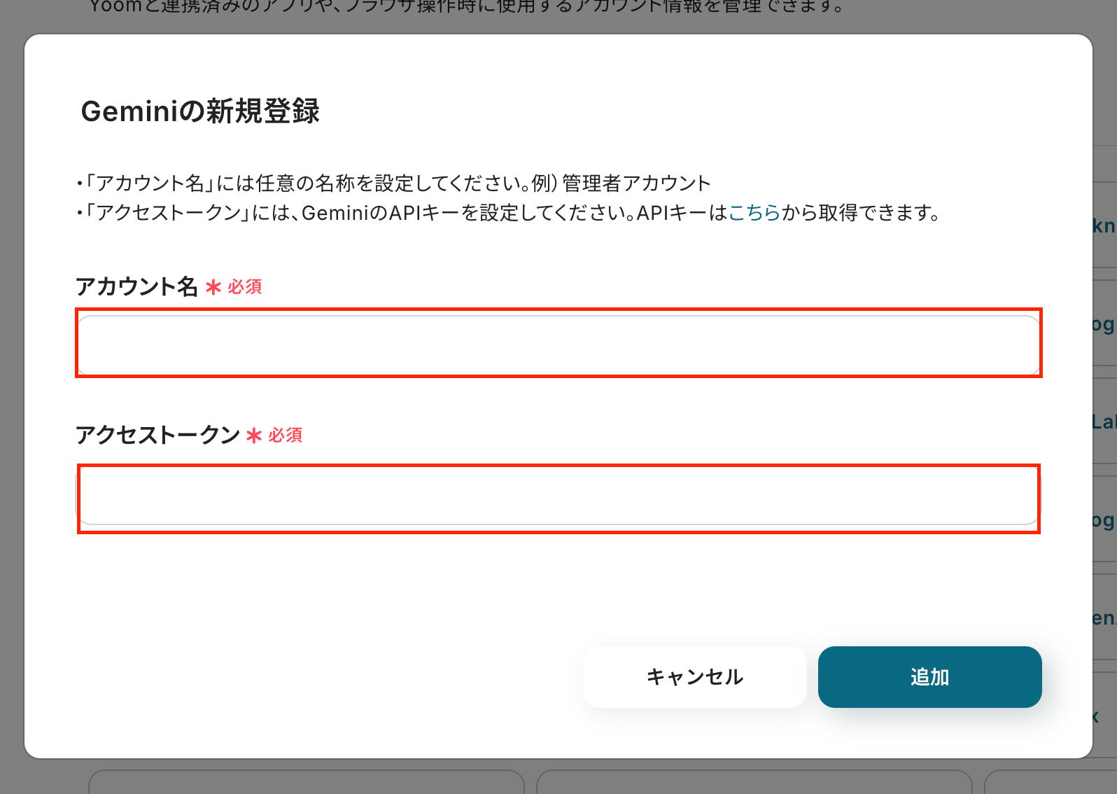 アカウント名には任意の値を入力しましょう。 アクセストークンはGeminiのAPIキーを設定しましょう。 APIキーはこちら から取得してください。