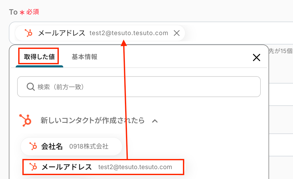 メールの設定に進みます。ToにはHubSpotの取得した値からメールアドレスを選択しましょう。
