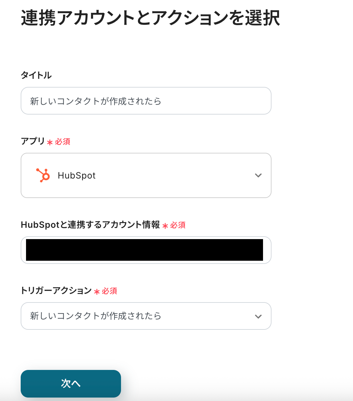 連携アカウントとアクションを選択する画面は、以下を確認したら、次へをクリックしましょう。