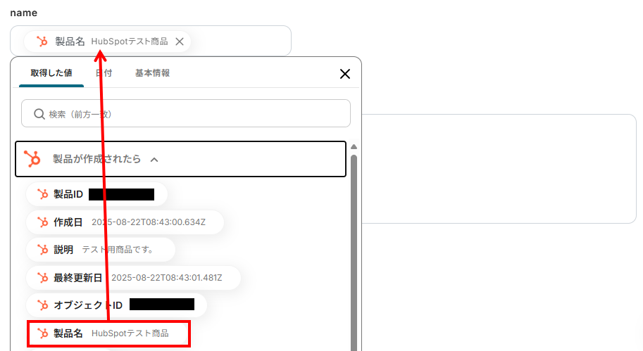 - name:こちらにはHubSpotで取得した値の「製品名」を引用しましょう。