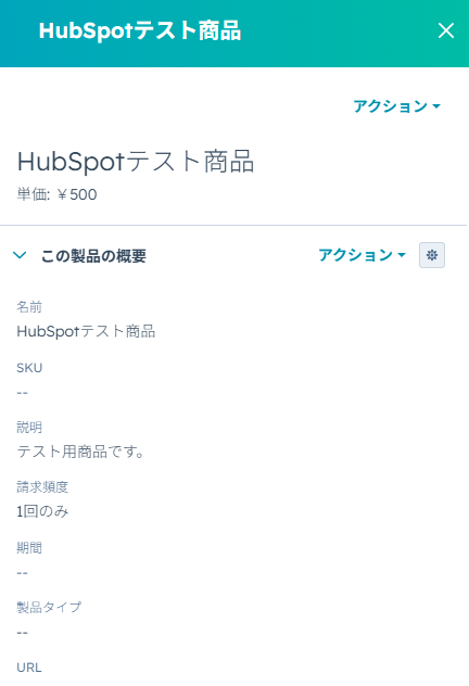 次に連携テストを行います。テスト実行の前にHubSpotに移動してトリガーとなる製品を登録してください。