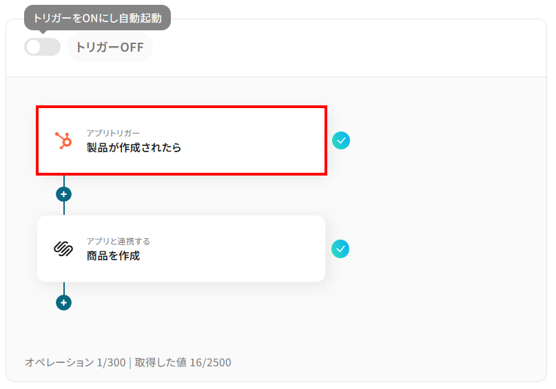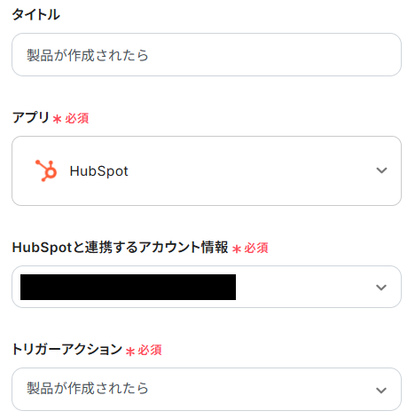 HubSpotと連携するアカウント情報と、トリガーアクション「製品が作成されたら」を確認したら次へをクリックしてください。